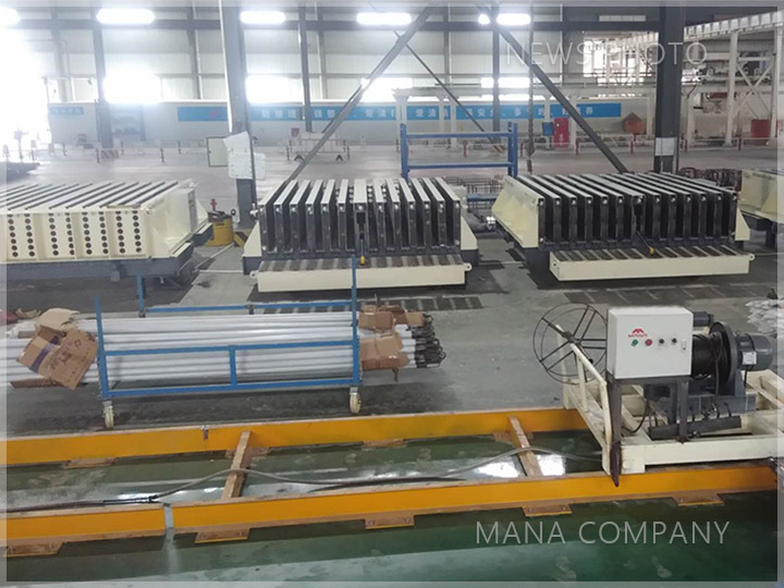 1.M01輕質墻板生產線采用自帶液壓開合系統的成組立模在固定工位操作,由人工輔助抽芯/穿芯。