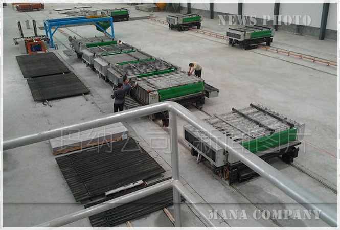 5) 養護完成后,模具行走至出板機構工位,開模,再由出板機把墻板推出,以供打包。